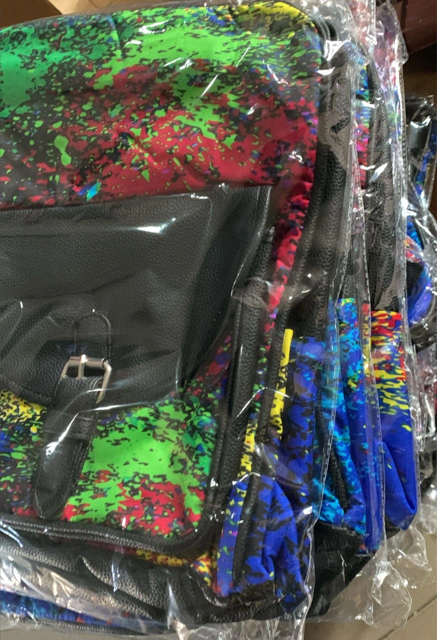 African print branded backpacks, wallets, side-bags and lunch boxes.