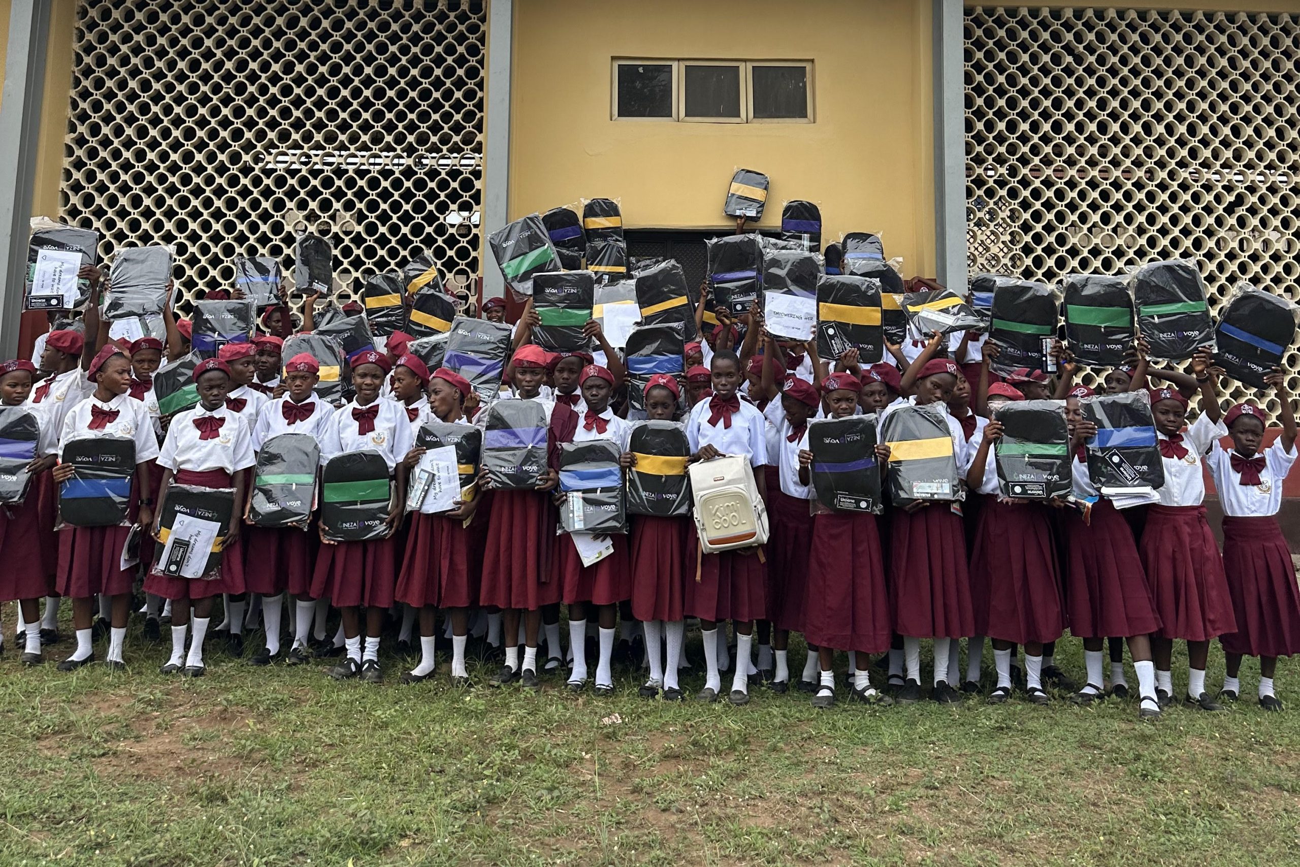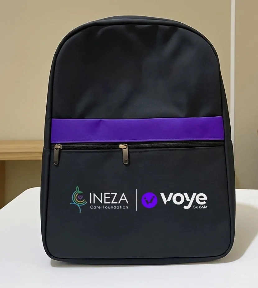 African Things produced 1,000 branded school backpacks for Ineza Care Foundation, co-branded alongside their partner Voye, for distribution to female secondary school students across Nigeria. The backpacks were manufactured in black cordura-style fabric with bold colour-blocked accent panels across the front pocket, produced in four distinct colourways — purple, blue, green, and yellow — to allow for easy identification across different student groups or school batches.
