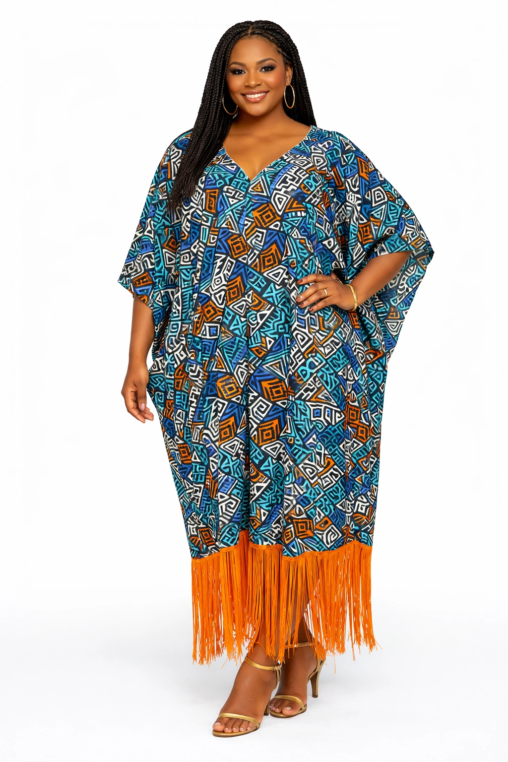 A bold statement kaftan dress featuring African prints and eye-catching fringe details.