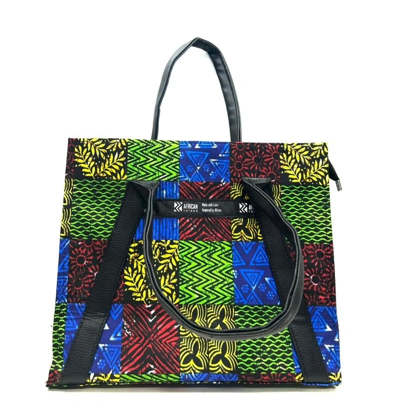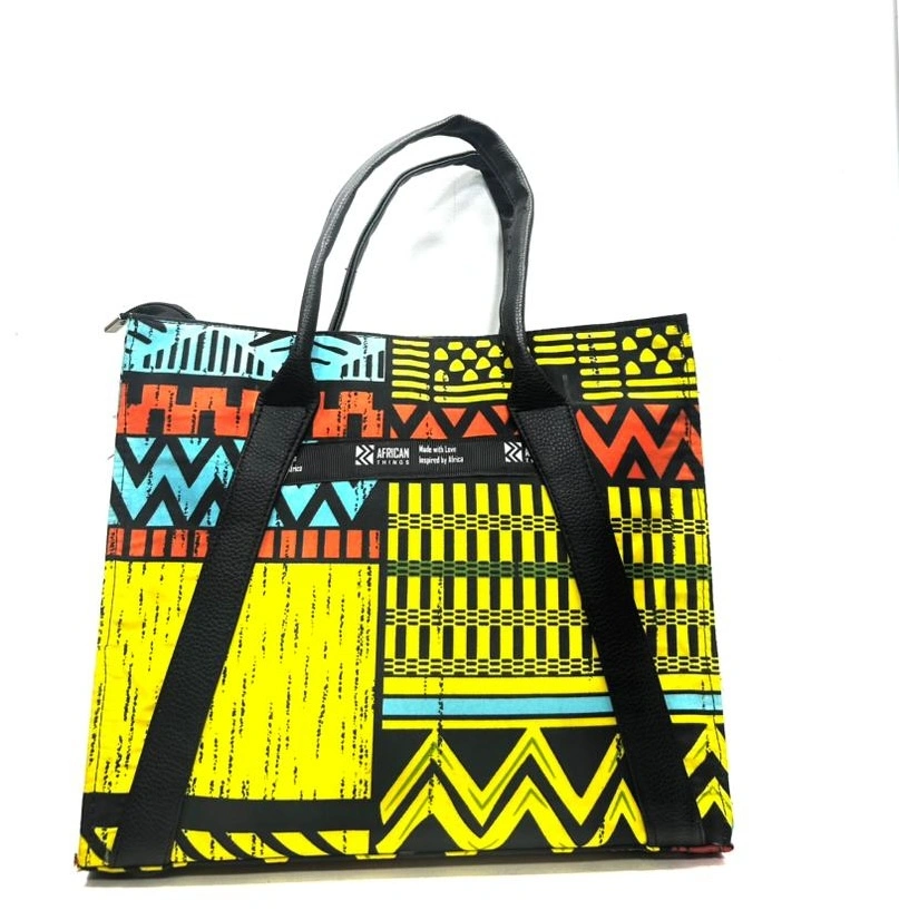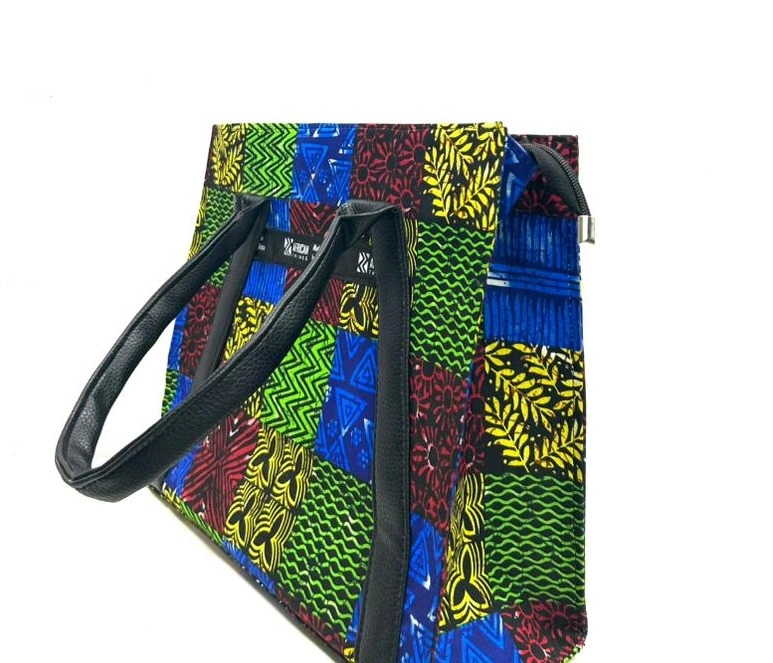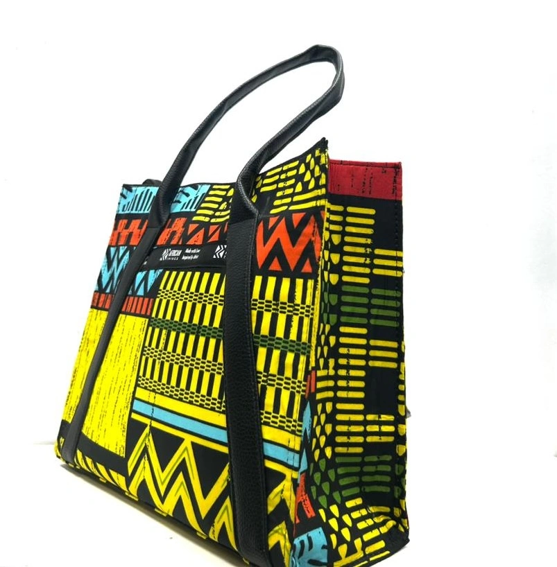 Premium handbag combining high-quality leather with vibrant Ankara fabric and intricate embellishments, perfect for women who want to showcase cultural heritage with sophisticated style.