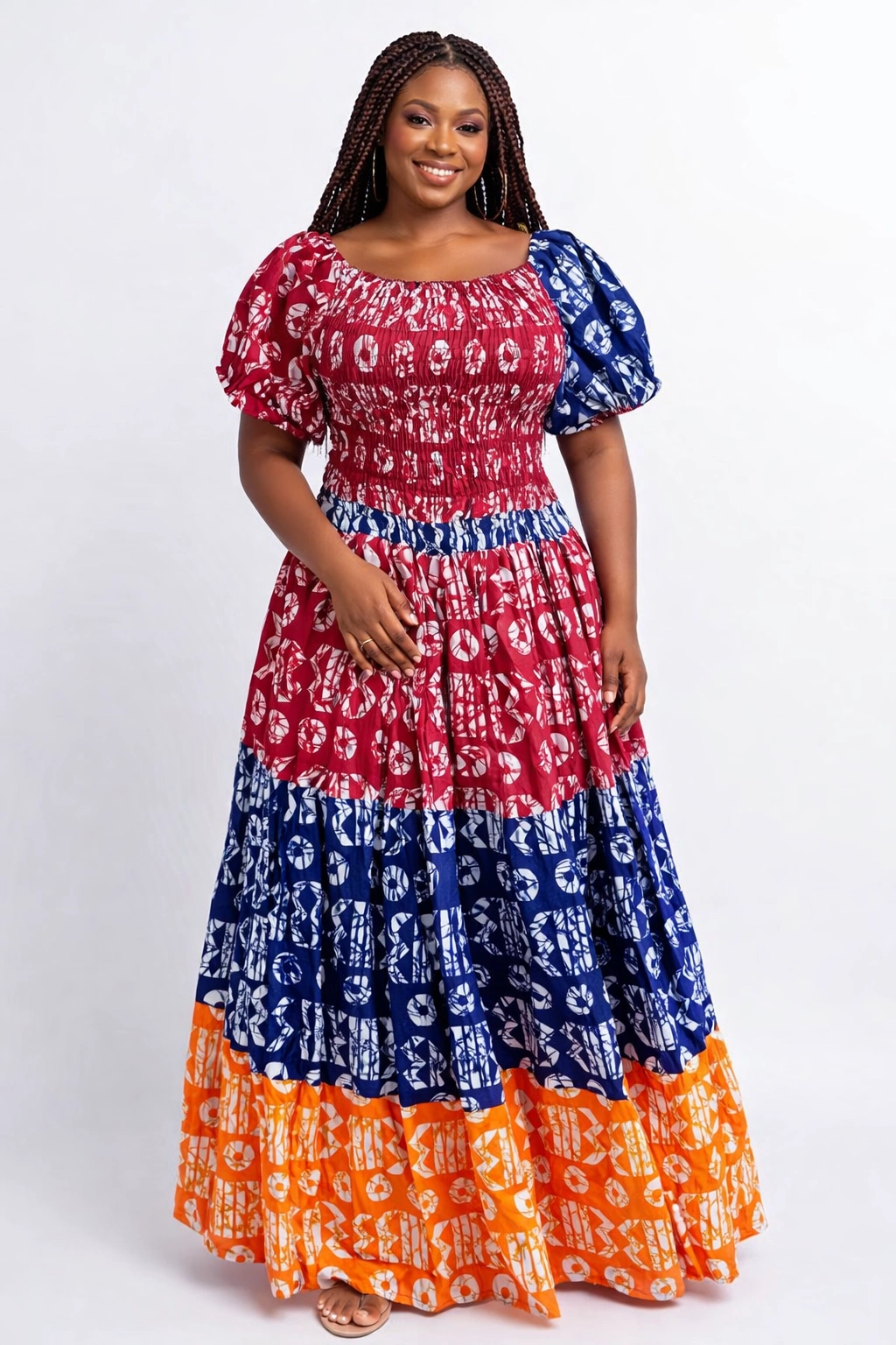 The Puff-Sleeve Smocked Bodice Tiered Maxi Dress is all about movement, comfort, and soft elegance. Made from breathable rayon fabric, it features a stretchy smocked bodice that fits comfortably while allowing flexibility.